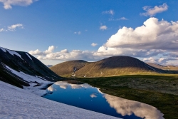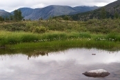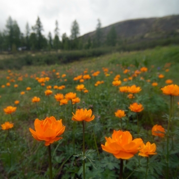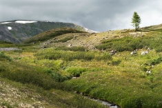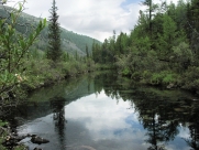 Приближаемся к границе леса В половине шестого, пройдя после развилки еще 2,5 километра, достигаем лесного оазиса в стороне от лавового поля, и обнаруживаем здесь оборудованную стоянку и ручей Ираг-Жалга с живописным озерцом-купальней, со всех сторон окруженный жарками, водосбором, родиолой и другими цветами, приятно радующими глаз после ягеля, багульника, бадана и прочей скудной растительности лавового поля. Очень хотелось бы встать здесь на стоянку, но времени еще слишком мало, и надо идти до Харганаты.