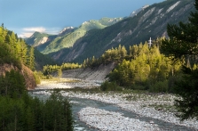 Заоблачные вершины Наконец, возвращаемся в машину, и не заезжая в Слюдянку, продолжаем путь. Практически от самого Култука путь этот пролегает на запад вдоль Иркута. Вскоре справа вдалеке вырастает стена высоких гор с шапками облаков на вершинах – это Тункинские Гольцы, они отделяют с севера долину Иркута от долины Китоя. Потому и дорога, по которой мы движемся, называется Тункинский тракт, да и весь этот район Бурятии - Тункинский. Первая остановка в Кырене, где мы регистрируемся у МЧС-ников (это занимает примерно пол-часа, за это время удается немного погулять по поселку, и сделать пару снимков).