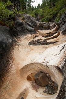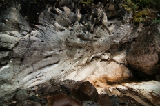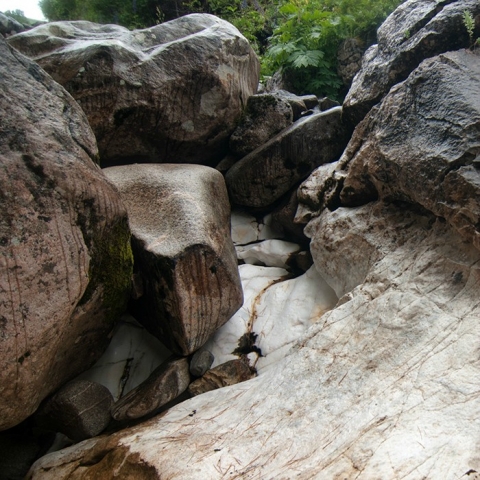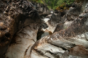 После Бьющего воды в каньоне заметно прибывает, в русле начинает попадаться мрамор, а иногда проглядывающее солнце заставляет переливаться и радостно сверкать разноцветную мозаику каменного ложа реки. Несмотря на то, что водопадов дальше не видать, высокий каньон сам по себе очень красив и живописен. Впрочем, метров через триста после Бьющего обнаруживаем еще один четырехметровый водопадик, но дальше снова чисто. Знаем, что где-то на Урда-Шане есть еще водопад Мраморный – интересно, получится ли его найти… Продолжаем спускаться по левому краю каньона, время от времени фотографируя его.