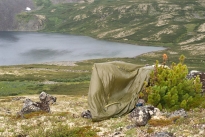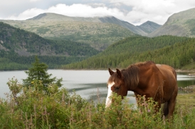 Живописный уголок   Вскоре после зимника тропа взбирается на крутой бом, набрав метров тридцать высоты и следует узкой полочкой над озером, затем немного спускается и подходит к стоянке на живописном заливчике Хара-Нура, где уже стоит чья-то палатка. Подойдя поближе, и поговорив с ее владельцем, выясняем, что это супружеская пара из Иркутска, забросившаяся сюда лошадьми для месячного отдыха и рыбалки. Сразу видно, люди понимают толк в отдыхе, и знают, где есть красивые места! Напоследок мужчина советует внимательнее смотреть на развилки троп, чтобы не уйти случайно на лаву. Тогда мы не придали особого значения этим его словам.