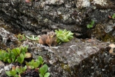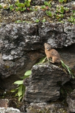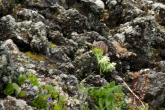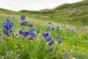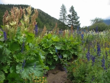 Наконец спускаемся и перекусываем. Дождь вроде кончился, но все равно пасмурно – на Кропоткина решаем не ходить (благо, на нем мы в прошлый раз были), и в результате продолжаем путь вместе с нашими компаньонами, идя вдоль правого края лавового поля дальше на север, до развилки троп. По обе стороны тропы - полоски луговины с пышным разнотравьем (борец, дельфиниум, пижма, золотой корень, ревень, тысячелистник и многое другое), что разительно контрастирует со скудной флорой, покрывающей лаву, представленной в основном лишайниками, шишкей и баданом. У подножия лавовых складок долины