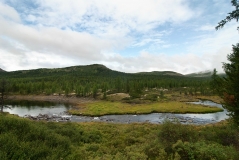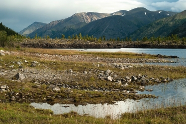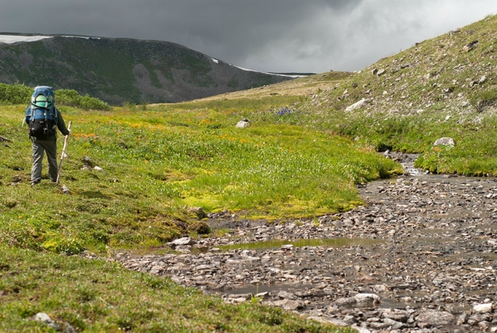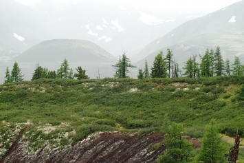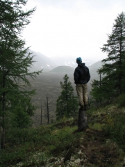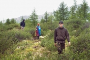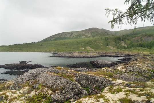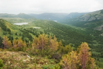 Вскоре из-за деревьев начинают проглядывать олоннурские озера, оставленные нами далеко внизу. На часах восемь, а до перевала еще далеко. Набор 250 метров высоты на 2,5 километра пути, под довольно тяжелым рюкзаком (около 30 кг), с непривычки дается мне тяжеловато, и из-за частых передышек отнимает два часа вместо желаемого одного. Москвичи же оказались довольно выносливыми пешеходами (особенно, молодежь), и почти всегда идут впереди, правда, и рюкзаки у них существенно полегче. Последние полтора километра до озера проходят по долине того самого ручья Хи-Оруг, поросшей ёрником (карликовой березкой) и курильским чаем, и уже гораздо более пологие (набор высоты всего 50 метров).  Над Олон-Нуром