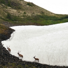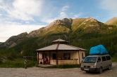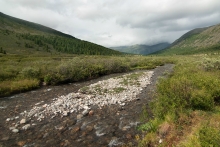 После снежника тропа то идет прямо по заболоченной пойме Барун-Хадаруса, растекающегося по ней живописными протоками, то снова взбирается на левый борт долины. К сожалению, недостаток времени не позволяет отвлекаться на фотосессии, хотя уже понятно, что в Долину вулканов мы сегодня не попадаем. Периодически начинается дождик и вообще становится холодно и промозгло, хочется уже поскорее встать лагерем, решаем сделать это у последней избы, к которой прибываем  к девяти вечера, отшагав за день 22 километра.