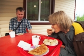 Только ставим палатки и разводим костер, как начинается дождь. Вот тут-то и пригождается зимник! Пока ужин варится на улице под дождем и ветром, мы сидим в сухости и тепле (молодежь затопила еще и печку, чтобы ночевать прямо на нарах), и ведем беседы. Судя по надписям, выцарапанным на столе, за пару дней до нас тут побывала еще одна группа (кажется, из Красноярска). Едим побольше лука и чеснока, дабы сегодняшние многочисленные броды остались без последствий, ужинаем и пьем чай из ревеня с лимоном. Допиваем остатки горячительных напитков – завтра наши пути с москвичами разойдутся, это последний совместный вечер. Наконец, расходимся, второй день пешки закончен.