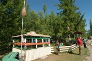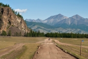 Ждем, пока нас зарегистрируют в МЧС Вторая остановка на въезде в Монды, где нас регистрируют пограничники. Где-то поблизости располагается знаменитая Саянская астрофизическая солнечная обсерватория, лучшая в стране, но и туда заезжать некогда (к тому же требуется заранее заказывать пропуска). Далее основная дорога уходит на юг в Монголию (граница всего в восьми километрах), мы же сворачиваем с нее вправо и продолжаем движение на запад.    В тункинской долине