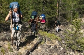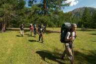 На поляне мы находим наших москвичей, уже вовсю стапелящихся. Четверо из них (двое взрослых, и двое юношей), с которыми мы успели подружиться еще в поезде) собираются поглядеть на вулканы, и готовы потратить на это 4-5 дней (а затем сплавиться одним катамараном-четверкой по Жомболоку и Оке). Сочтя, что сообща дорога будет и веселее, и безопаснее, предлагаем им отправиться в Долину вулканов вместе, они соглашаются, и вот, быстренько перекусив, в половине пятого начинаем наше пешее путешествие.