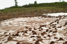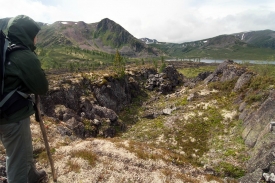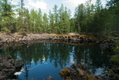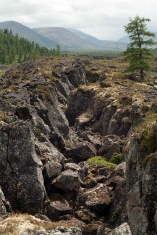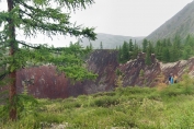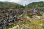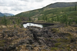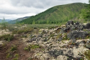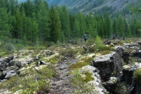 Дальнейший наш путь лежит на север от Перетолчина, на северный край долины Вулканов, к озеру Харганата. Тропа проходит по правому краю лавового поля. В центре долины - километры лавы, поросшей баданом, ягелем и редкими лиственницами. В некоторых местах лава топорщится небольшими складками-возвышениями.
