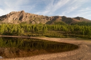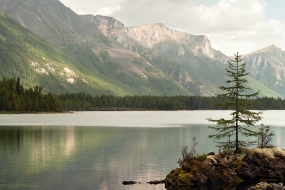 Последний километр тропы под теплым вечерним солнцем и, наконец, в начале седьмого выходим к Бурсагай-Нуру. Освещенное солнцем, озеро представляет собой поистине волшебную картину – ярко просвечивают камни дна с зелеными пятнами водорослей, вода кажется изумрудной, а от берега тянется узкий мысок с расширением на конце и одиноким деревцем на нем. Не успели отдельные элементы пейзажа сложиться в какую-либо композицию, а я уже бросаю рюкзак и спешно достаю фотик, чтобы успеть поймать свет, но только собираюсь нажать на спуск, как солнце прячется. С досадой обнаруживаю, что спряталось оно в неизвестно откуда набежавшую тучу, конца которой не видно. Без солнца озеро кажется совсем серым и невзрачным, поэтому полчаса упрямо продолжаю ждать, но чуда не происходит – солнце ушло совсем, приходится смириться с несостоявшимся снимком и, сделав парочку дежурных кадров, продолжить путь   Горное озеро