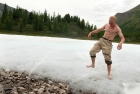 Наледь на Барун-Хадарусе #4 Вблизи белое пятно оказывается толстой глыбой многолетнего льда (с несколькими слоями гальки внутри) с небольшим слоем фирна поверх. С изгрызенной солнцем кромки тающий лед каплями стекает в небольшое озерцо, лишь зайдя в центр которого в поисках очередного ракурса, я понял, насколько теплая вода в Барун-Хадарусе - здесь ноги начинает ломить уже через несколько секунд. Молодежь раздевается по пояс и бегает по снежку, позируя фотографам. После чего вброд возвращаемся обратно на тропу. Наледь на Барун-Хадарусе #9