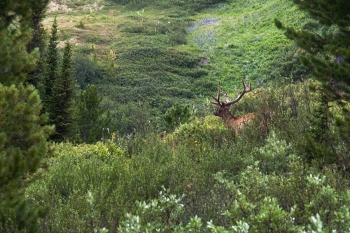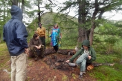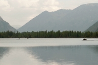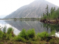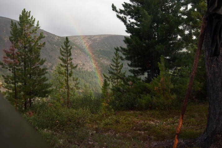 Радуга над Хара-Нуром   Доходим до наших рюкзаков, забираем их, и к семи вечера возвращаемся на северо-западный край Хара-Нура, к месту нашей ночевки. Солнце игриво подсвечивает окружающие красоты, призывая нас остаться и насладиться еще одним волшебным вечером, но сегодня у нас в планах ночевать на северо-восточном крае озера, в устье Буштыга, поэтому, не тратя времени попусту, выдвигаемся в путь. Тропа набитая, хорошо заметная, но идется нелегко – много поваленных деревьев и корней – похоже, чистить тропы тут некому, поэтому они огибают все препятствия, отчаянно петляя. Переходим вброд Хойто-Шан, проходим мимо небольшого зимника. Теперь понятно, почему наши вчерашние соседи не захотели дойти досюда – места под лагерь тут абсолютно нет, со всех сторон дремучий лес, сквозь который озеро едва-едва проглядывает. Иногда тропа удаляется от Хара-Нура еще дальше, и единственными источниками воды становятся редкие броды.