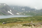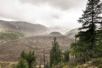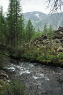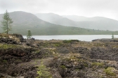 Выходим несколько позже обычного, в районе половины одиннадцатого. Хмурое дождливое утро не дает повода спешить – видимо, наш крюк на Тухурен-Нур и последующую радиалку через перевалы придется отменить, слишком низкая облачность. А это значит, что идем с москвичами до Перетолчина, а дальше либо бежим без вещей до Кропоткина (если погода разгуляется), либо идем до следующего озера – Харганата – где и ночуем. Переходим приток вброд, и вскоре достигаем лавового поля.