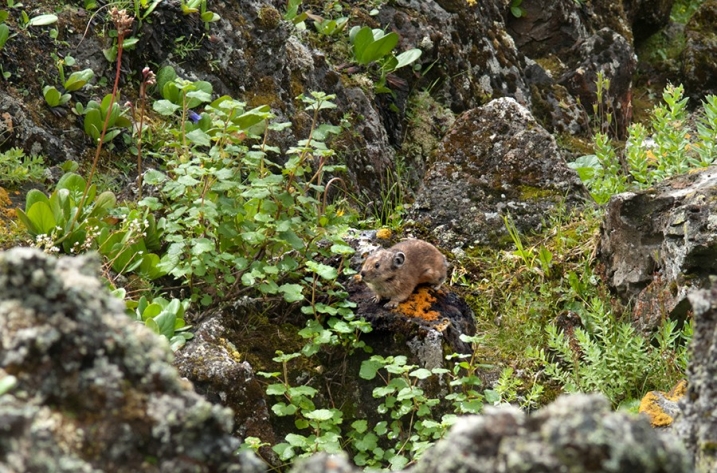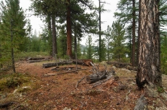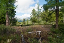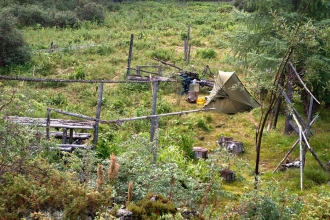 Продолжаем путь, в надежде заночевать на самом южном конце Хара-Нура, но тропа начинает все сильнее удаляться от озера, обходя высокую лавовую платформу. Как оказалось, больше Хара-Нура мы в этом походе не увидим. К девяти вечера достигаем стоянки перегонщиков скота на пологой лесной террасе сбоку от лавового поля, со столом и нарами из жердей, каркасом для тента, и хорошо удобренной коровками поляной вокруг. По карте где-то здесь должен быть источник воды (к озеру выйти мы уже и не надеемся), последний на участке от Хара-Нура до Хакты (до которой сегодня тоже дойти уже не успеваем). Не очень ровно, но жить можно. Встаем на ночевку прямо здесь, а ручей, низвергающийся с левого борта долины узким водопадом,  обнаруживается в ста метрах ниже по тропе. Рядом со стоянкой есть сравнительно пологий выход на лавовое поле, рельеф которого здесь еще более “горный”, чем у Харганаты. Снова слышен веселый свист пищух, а вскоре и сами сеноставки не замедляют показаться. За день пройдено 13 километров. Седьмой ходовой день закончен.   Наш лагерь рядом с летником