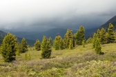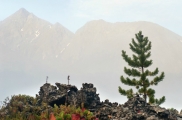 Бастионы лавы Примерно через час после расставания с москвичами поднимается сильный ветер и стремительно надвигается практически черная грозовая туча. Прибавляем шагу, пытаясь поскорее уйти с открытого поля, и достичь островка леса у подножия Буда-Ханды. Ветер мечется и постоянно меняет направление, точно так же и туча внезапно уходит в сторону, давая нам еще немного времени. Тропа между лавой и лесом