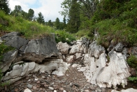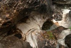 Урда-Шан чуть выше водопада Мраморный   Километра через полтора после Бьющего тропа отходит от каньона, и мы снова натыкаемся на пересохшее русло Мраморного, решая на этот раз дойти по нему до конца. Через несколько минут выходим к устью. Широкое мраморное ложе ручья врезается в Урда-Шан и тут же заполняет его на всю ширину, практически сразу обрываясь зазубренным закругленным карнизом цвета слоновой кости, с которого вода, прямо из под наших ног, плавным сливом улетает куда-то вниз – водопад!   Верхний бьеф водопада Мраморного