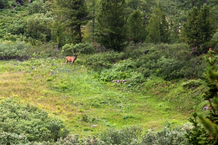 Кусочек Олон-Нура   Сразу после второго мостика тропа уходит в сторону от озера и вскоре разделяется – основная уходит в южном направлении на перевал Дэдэ-Хутэл. Это один из двух простых перевалов (хутэлов) между долинами Сенцы и Жомболока, а именно, верхний (“дэдэ”), второй находится ниже по Сенце, и соответственно, называется нижний (“додо”), наша же тропка идет в западном направлении и вскоре теряется в болотистой луговине, идти приходится практически по азимуту, периодически по щиколотку чавкая в холодной жиже. Наконец болото заканчивается, и мы переходим ручей Хи-Оруг, после чего снова появляется выраженная конная тропа, которая сразу же начинает резко взбираться наверх.