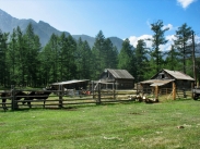 Изба на Барун-Хадарусе (дальняя от вулканов) К шести достигаем ближнего зимника (есть еще дальний, перед самой Долиной вулканов), здесь можно было бы неплохо встать, но надо идти дальше. Еще через полчаса по противоположному берегу Барун-Хадаруса замечаем белое пятно большой наледи, выглядящей весьма необычно на столь скромной  высоте, среди окружающей зелени лугов. Разумеется, не можем отказать себе в удовольствии сходить к ней и как следует поразглядывать.