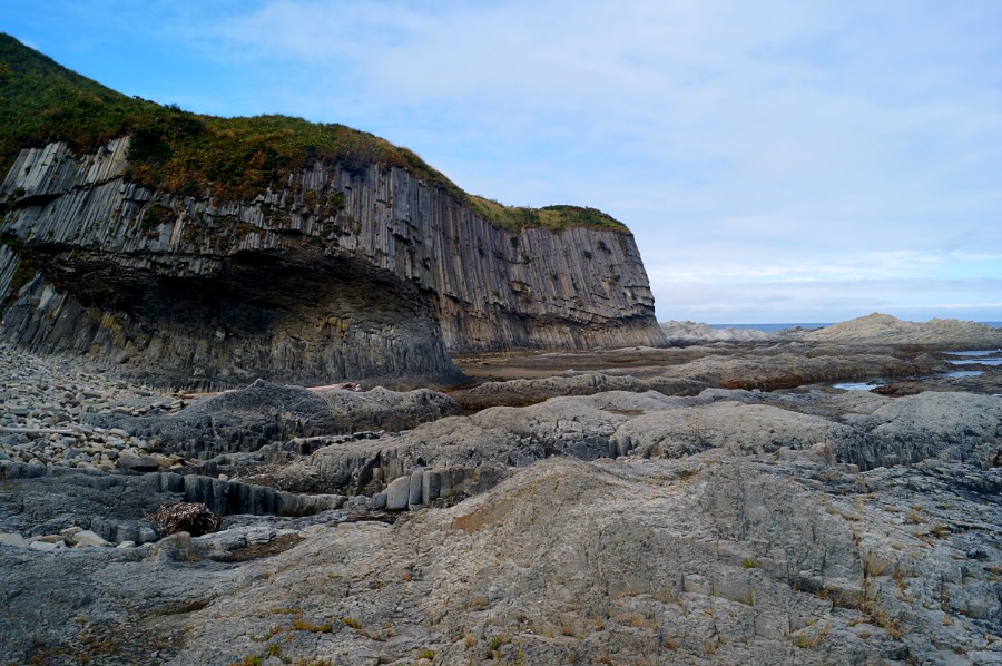 Краткое описание:Мыс Столбчатый сложен наслоениями базальтовых лав вулкана Менделеева с хорошо выраженной столбчатой отдельностью в виде пяти- и шестигранных колонн. В результате волновой эрозии массив вулканических пород постепенно разрушается, в результате чего мыс представляет собой живописные отвесные скалы высотой до 40-50 м, вдающиеся в Кунаширский пролив несколькими выступами. Постепенно скалы разрушаются, образуя у подножий осыпи из каменных «столбов»