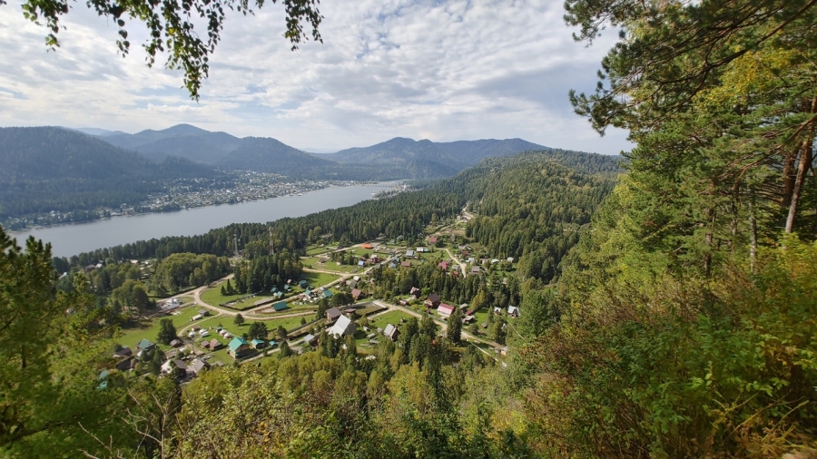 Объекты на фото: Населённый пункт Артыбаш     Река Бия     Населённый пункт Иогач     Вершина Перлу (Тилан-Туу, 741 м)     Озеро Телецкое