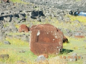 Далее наш путь лежал к Аху Те Пито Кура (пуп земли в фольклоре жителей острова Пасхи). Возможно, здесь устраивались когда-то ритуальные обряды. Камень очень горячий на солнце. Приложившись к нему, мы немного поколдовали.