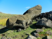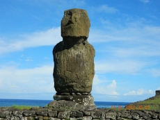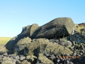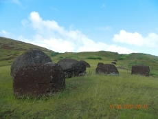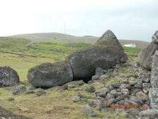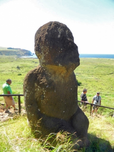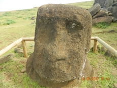 Гид рассказала нам, что тела великанов вырубались на склонах вулкана Рано-Рараку (Rano-Raraku), шапки изготовлялись на склонах другого вулкана на другом конце острова, а затем каким-то способом транспортировались и расставлялись по всему острову. Кроме склона вулкана Рано-Рораку (где статуи просто закапывали или оставляли недоделанными), все остальные статуи устанавливались недалеко от берегов океана на заранее подготовленные платформы (постаменты аху) обычно в шеренгу, хотя встречаются и одиноко стоящие идолы. На всех платформах моаи смотрят на остров, и есть только одна исключительная платформа, где они смотрят на море. Предполагают, что взгляд моаи придавал острову силу. Поэтому их якобы и уронили вандалы во времена каких-то междоусобных войн. Конечно, часть статуй могла упасть и сама, например, при землетрясениях или цунами. Точных ответов на все эти вопросы нет. Как и нет ответа, как их перемещали по всему острову. Следов каких-либо дорог не обнаружено, а вес некоторых великанов достигает 40 тон. Даже современной технике составляет огромную проблему взгромоздить относительно легкую шапку на голову статуи, неговоря о перемещении многотонных тел по склонам острова. Когда был открыт остров Пасхи, местные аборигены говорили, что статуи ходили по острову сами. Это и пытался доказать Тур-Хейердал, много лет живший на острове. Раскачивая веревками статую (как бы заставляя ее шагать), усилиями многих людей они смогли переместить относительно небольшую статую на несколько метров, и это по ровной поверхности. Как передвигались великаны по острову? Ответа на эту загадку, наверное, мы никогда не узнаем. Можно, конечно, говорить, что жители острова умели отключать силу гравитации и перемещать статуи без всяких усилий. Ответ очень простой, только совершенно непонятно, как это они могли делать?..