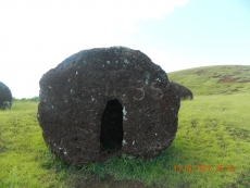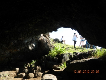 Зачем они делались, перетаскивались по острову, а затем водружались на головы статуй?! Непонятно! Ну, не для красоты же!.. Далее было запланировано посещение вулкана Рано-Као, но гид беспокоилась, что после сильного дождя мы не сможем подняться по крутому, грунтовому склону, и мы отдохнули в отеле два часа, чтобы дать дороге просохнуть. По пути к вулкану заехали к живописной бухте с вулканическим гротом.
