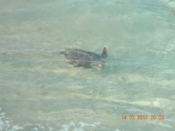 зашли на почту, чтобы поставить штамп (с тремя статуями моаи) в загранпаспорт. Меня потом часто при паспортном контроле спрашивали: "Это в какой стране такие штампы? Уж не с острова ли Пасхи?" И удивленно качали головой... Побывав еще раз на берегу, мы увидели много частных яхт и круизный лайнер, с которого на катерах перевозили туристов на берег. В небольшой лагуне плавала морская черепаха.