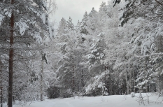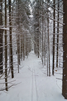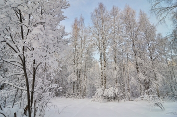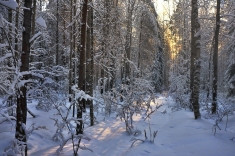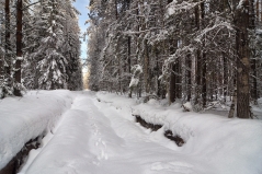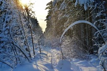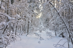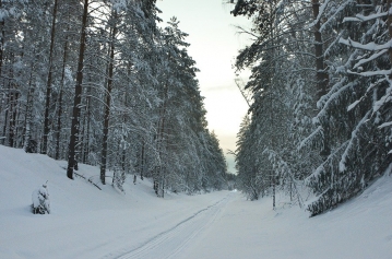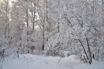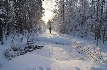 С утра столбик термометра на границе разметки, температура стремится к 30-ти. На улице  солнышко, правда, почти не выглядывающее из-за макушек деревьев, но этого уже достаточно, чтобы скупые зимние краски заиграли цветами. Так как останки дороги густо заросли кустами, решено идти вдоль нее по лесу, благо лес чистый и вполне проходимый. Примерно через километр замечаем, что дорога, хотя и остается ненаезженной, но кустов стало меньше, и по ней уже можно идти. Это вселяет в нас оптимизм и надежду, что дополнительный день не понадобится.  |