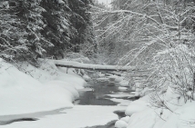 На берегу в кустах свежая лежка лося. Так как идет слабый снег, то видно, что лось ушел недавно, снег еще не успел ничего припорошить. Немного идем по его следам. Следы тянутся вдоль русла, пересекают его и уходят в лес на другом берегу. Вся пойма изрисована следами зайцев. Похоже, что зайцев здесь много - их следы сопровождают нас почти до конца похода.  |