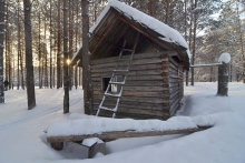 В районе урочища Лесоучасток №11 (предположительно, оставшегося на месте 11-го лагеря Унжлага) лес расступается и мы выходим на широкую не заросшую луговину. Впервые за последние дни мы замечаем старые заметенные снегом следы буранки. Это очень радует, так как угадать, где находится продолжение дороги в сплошной стене леса за луговиной, просто невозможно, а следы старой буранки выводят нас прямо на нее. На противоположном конце луговины обнаруживаем разрушенную избушку, от которой целыми остались разве что стены.  |