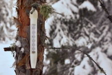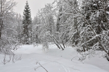 На следующий день становится теплее - с утра 20 градусов. И это реально ощущается – щеки и руки без перчаток мороз не обжигает. Солнышка опять нет, лес серый, идет небольшой снег. Как не хватает снежным шапкам на деревьях солнечного освещения и голубого неба! Фотографии получаются серыми и скучными, хотя кругом красотища. Сегодня по плану у нас самый тяжелый день – по карте дороги нет, на космоснимке она тоже практически не просматривается, т.е. из запланированных 14 км, семь - практически азимутом через лес. Но если смотреть план-схему Унжлага, то вдоль Торзати нарисована дорога. Интересно, что от нее сохранилось сейчас?  |