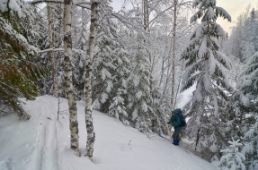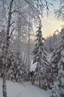 Наконец-то собрались, надели лыжи, побежали. На ходу становится тепло, останавливаться не хочется. Оказалось, что вчера не дошли совсем чуть-чуть до нормального соснового леса. Жаль. Но будем знать на будущее, что за километр до Северного есть хорошие места для ночевки.  |