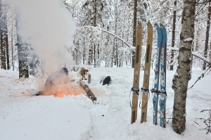 Стоянка в красивом сосново-еловом лесу. Без лыж ходить трудно, проваливаешься по колено и глубже. Яму под костер роем долго – снег глубокий, сверху рыхлый, потом идет толстый слой наста, который пробивается с трудом. На удивление, под настом снег влажный, еще не промерз. Дым от костра вьется в небольшой яме - большую сделать не хватило терпения и сил, да и сушина попалась неудачная, сильно чадит. На градуснике минус 17. Ложимся спать.  |