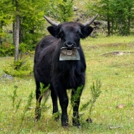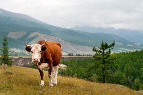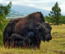 Левый берег Оки после стрелки становится высоким и скалистым, и остается таковым довольно долго, благодаря чему отсюда открываются весьма красивые виды. Сделав пару снимков, возвращаемся на дорогу и идем дальше. По дороге встречаем очередное стадо коров и яков, пытаемся их фотографировать, но яки не особо настроены позировать, поэтому оставляем их в покое и вскоре достигаем первой нашей цели – двадцатиметрового водопада "Малый Жомболок". | ![]()  |