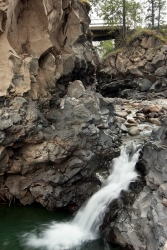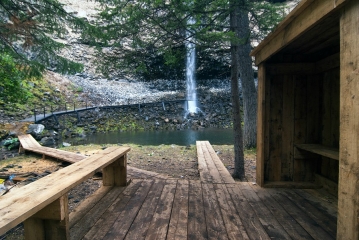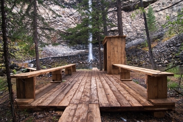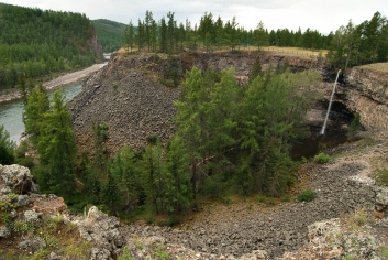 С удивлением обнаруживаем на месте одного из самых волшебных и величественных уголков Оки Саянской большую оборудованную поляну с лавками и навесами (практически, базарная площадь), асфальтированную дорогу рядом и большой железный забор по всему периметру водопадной чаши, с несколькими выступающими обзорными площадками. Вниз, к подножию водопада от забора в нескольких местах уходят железные лестницы с перилами (видимо, чтобы отдыхающие, приехавшие сюда на машинах, могли спуститься и искупаться в водопаде). Столь назойливое вмешательство цивилизации в первозданную сокровенную красоту этого места не может не вызвать нашего искреннего возмущения и праведного гнева. Фотографировать теперь тут стало особо нечего – всюду в кадр лезет этот забор, да и погода не располагает – хмуро и вот-вот начнется дождь. Поэтому отправляемся по асфальтированной дороге к следующей нашей цели – Сайлагскому водопаду, которой и достигаем в районе девяти.  |