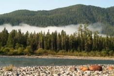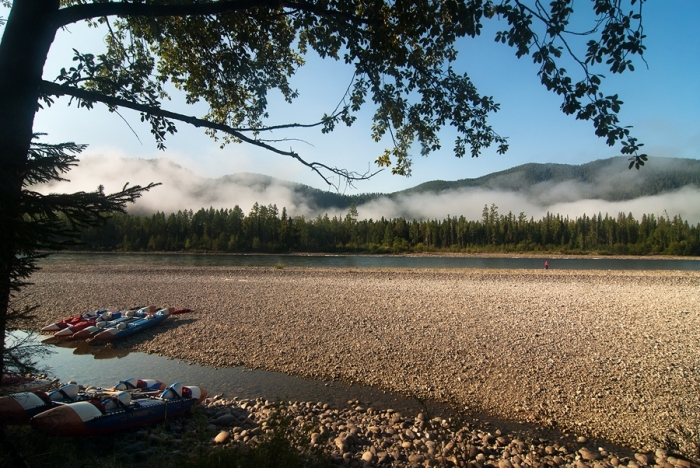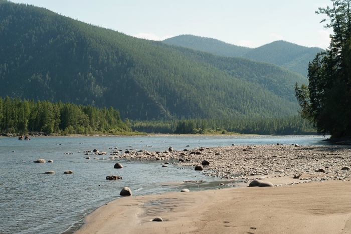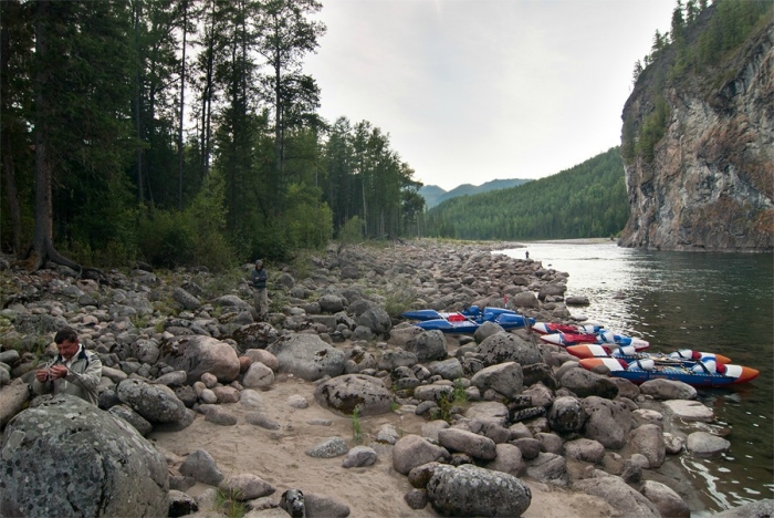Но, несмотря на то, что Орха-Бом кончился, по берегам продолжаются вполне симпатичные (хоть и невысокие) горки и скалы, а на реке периодически встречаются галечные шиверы, что придает сплаву хоть какую-то динамичность. Все больше моторок и катеров, все чаще встречаются свежепостроенные виллы. Иной раз даже сторожевые собаки бегают по берегу и пытаются отогнать нас громким лаем. И сюда добрались длинные цепкие щупальца цивилизации… Начинаем постепенно подыскивать большую оборудованную стоянку для нашей толпы, но с ними на этом участке реки обстоит довольно туго.