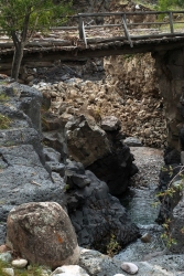 Примерно через полчаса после начала ущелья достигаем первого порога – Трех геологов. По нашей воде сложностей не представляет - лениво отгрябываемся от слабого навала на скалу правого берега, и спокойно встаем в улово, снимая прохождение четверок на гоупрошку. Еще через 20 минут сплава следующий порог – Пронеси Господи-1. Шивера, с крупным камнем посередине, проходится спокойно.