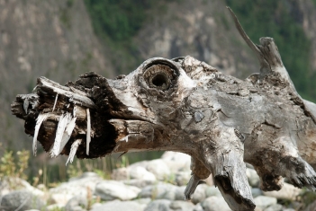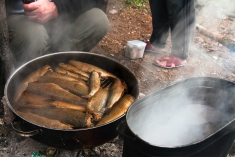 Печально наблюдать, что многие несознательные граждане из числа туристов вместо резьбы по дереву и прочих оригинальных поделок оставляют после себя в качестве экспонатов всякий мусор и хлам, типа разломанной гитары (которую дальше везти, понятное дело, смысла нет), рваных кроссовок и т.п. Увы, но весьма скоро музей этот рискует превратиться в банальную помойку… Наконец, баня готова - моемся, затем традиционные песнопения у костра и отбой.