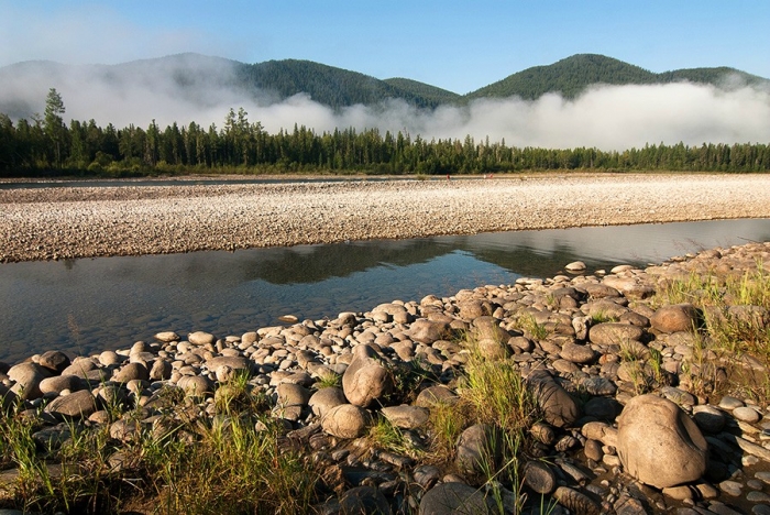 С утра солнце и густой туман. Снимаем скалы в тумане, завтракаем и, по традиции, в половине двенадцатого выходим. Сразу же проходим “Мельницу” – очередная чуть более мощная шивера. Через час проходим “Центрифугу” – последний именной порог на Оке Саянской. Наша двойка идет по центру – хорошие умывающие валики и неплохая бочка. Думаю, по большой воде порог должен быть довольно мощным и интересным. Четверки идут более спокойным левым краем струи.